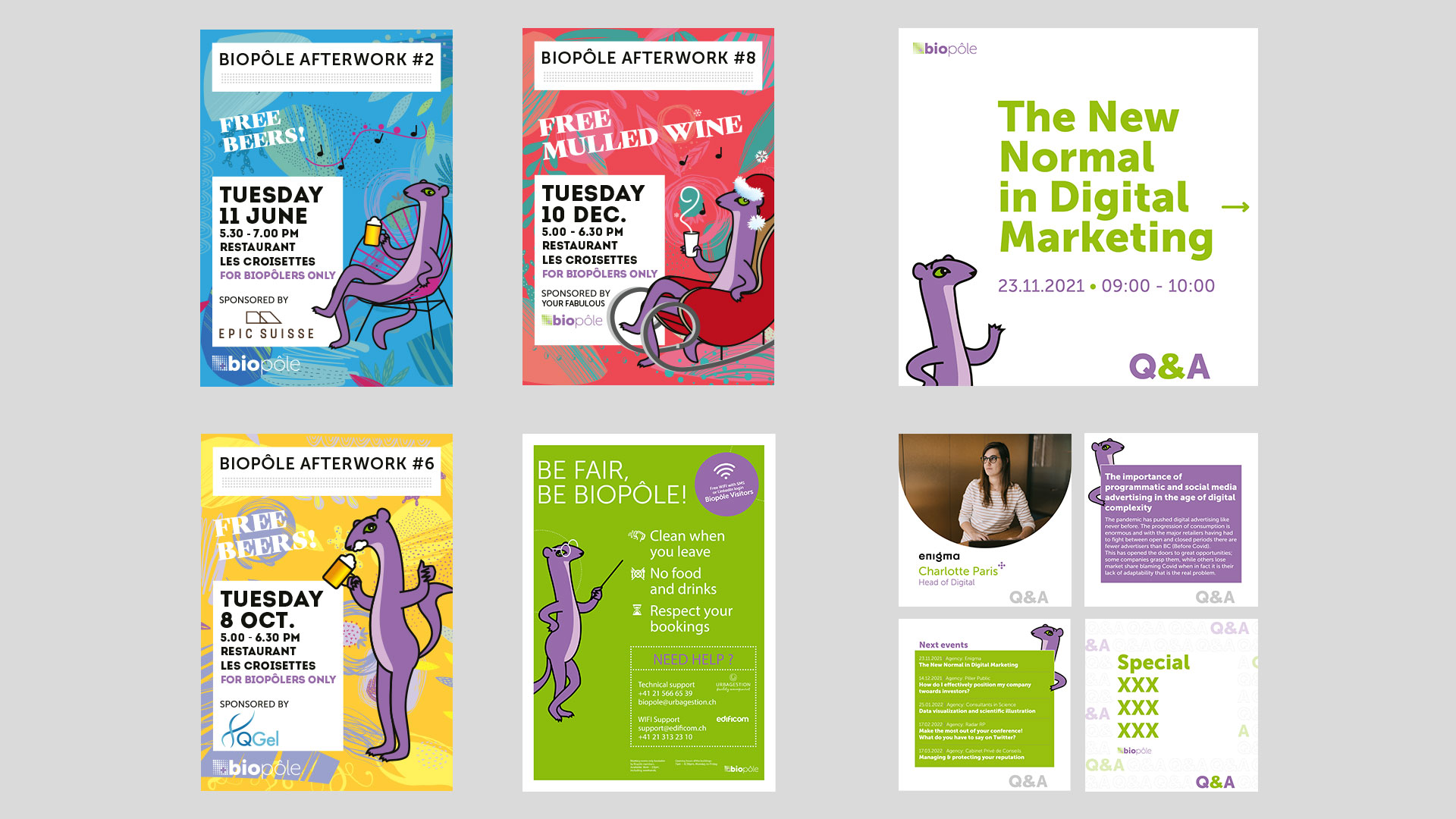- Création et réalisation de supports variés: brochures, affiches, rapports d’activité, cartes de vœux animées, templates pour les réseaux sociaux, posters et roll-ups qui présentent le Biopôle à travers le monde.