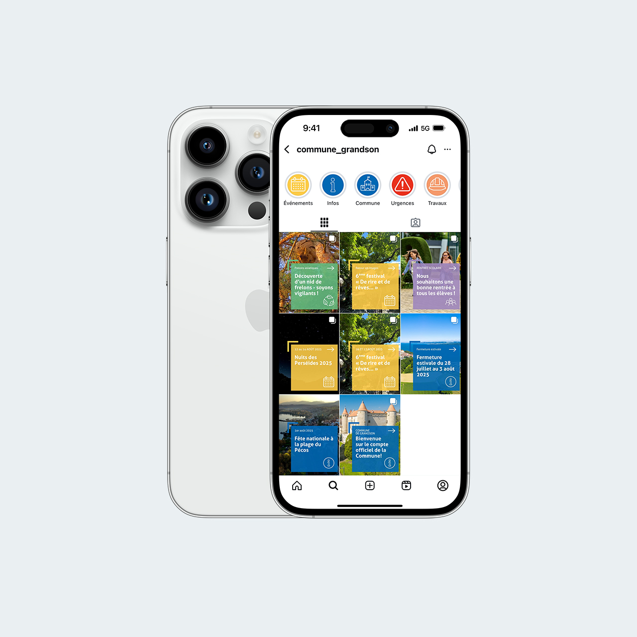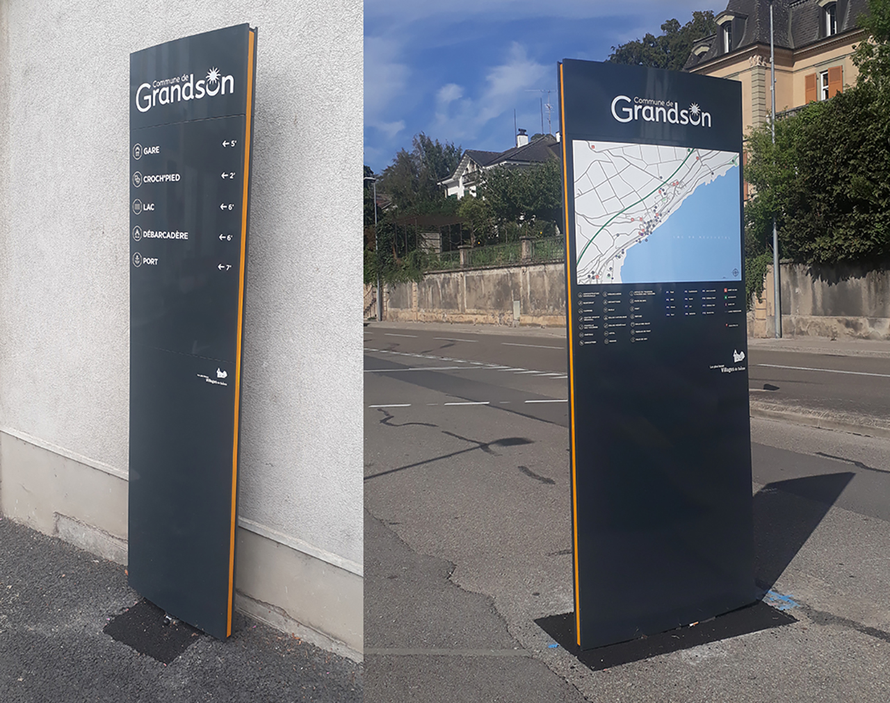 Nous avons conservé la lune et le soleil des anciennes armoiries de Grandson en les intégrant à la typograhie du logo. Les couleurs bleu et jaune demeurent, mais se coordonnent à la nouvelle identité, qui reflète le dynamisme et la convivialité de la Commune.
