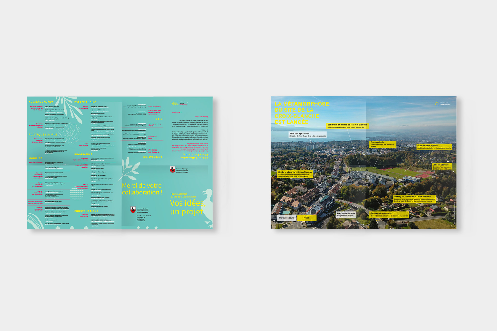 Dans un second temps, NOW* a eu le plaisir de concevoir et de réaliser le flyer pour la métamorphose du site de la Croix-Blanche. Conçu comme une feuille de route visuelle et accessible, il met en lumière les grands axes du réaménagement: mobilité, espaces publics, agriculture urbaine, habitat, convivialité et durabilité.