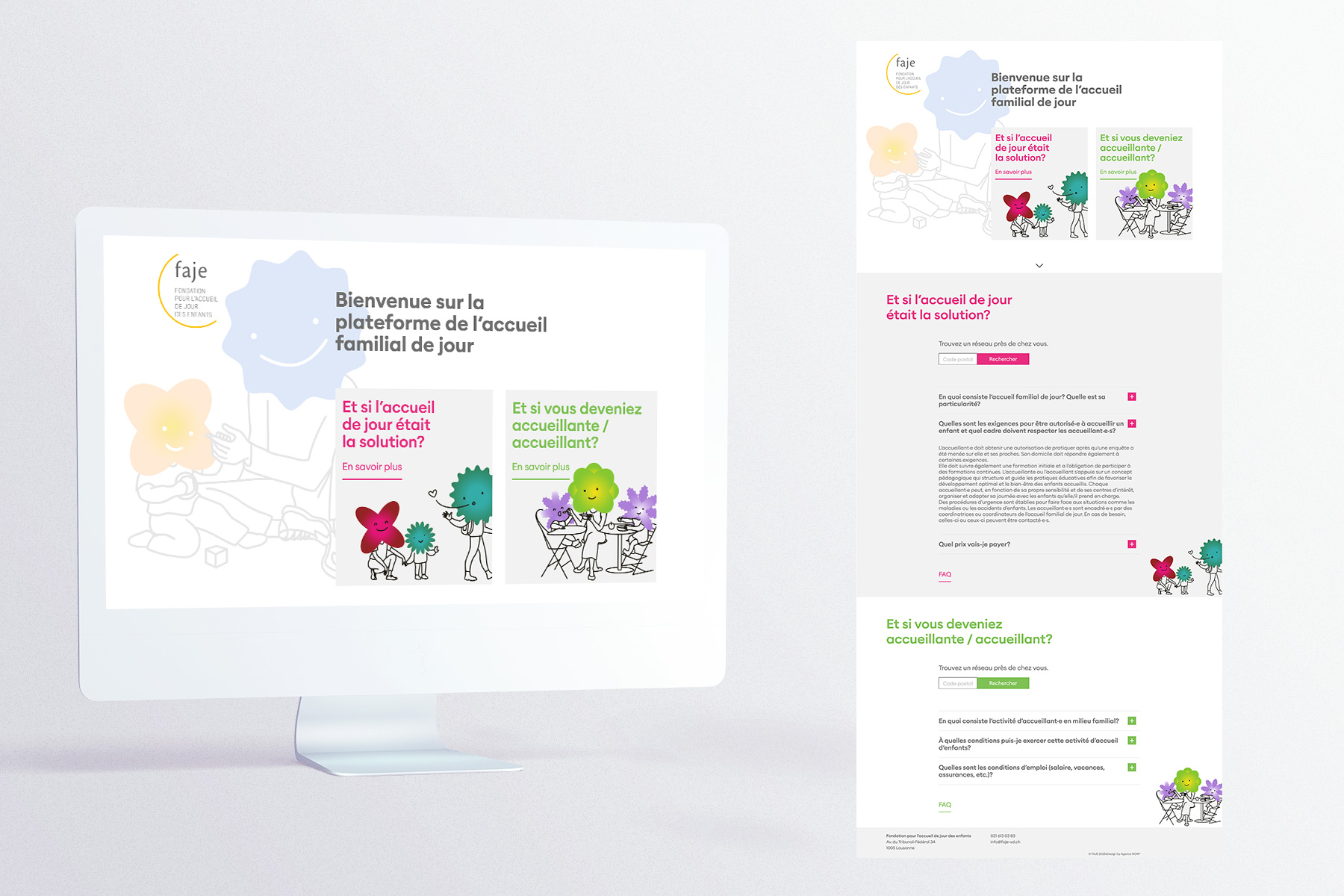 Enfin, un site internet a été développé pour servir de plateforme d’information, présentant les deux volets de la campagne, une FAQ dédiée ainsi qu’un moteur de recherche permettant d’accéder facilement aux différents réseaux d’accueil. Nous avons conçu et réalisé les maquettes du nouveau site web, pensé pour s’adresser aussi bien aux parents qu’aux professionnel·le·s et partenaires institutionnels.