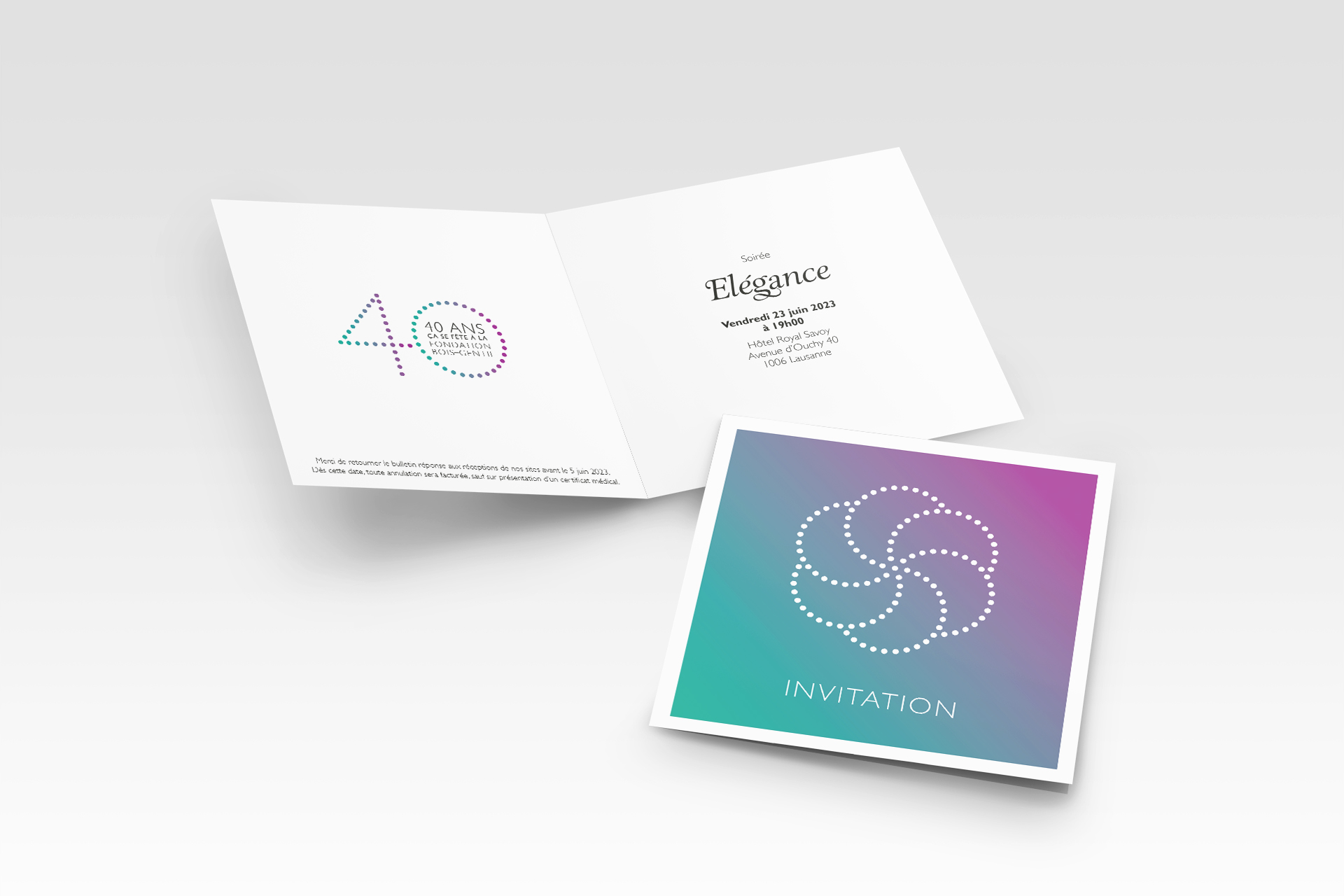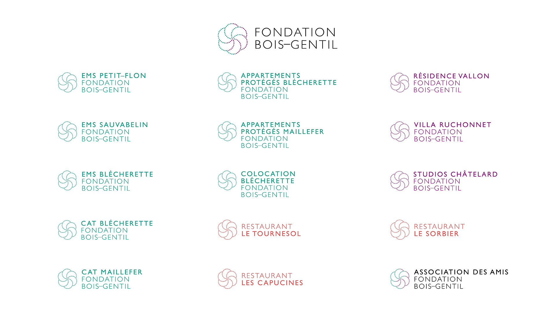 Les pointillés du logo reliés entre eux par un dégradé illustrent la notion de liens qu’exprime la signature. Ils se déclinent en différents codes couleurs pour chaque pôle d’activité: vert pour les personnes âges, violet pour la psychiatrie adulte et un rouge doux pour les restaurants.