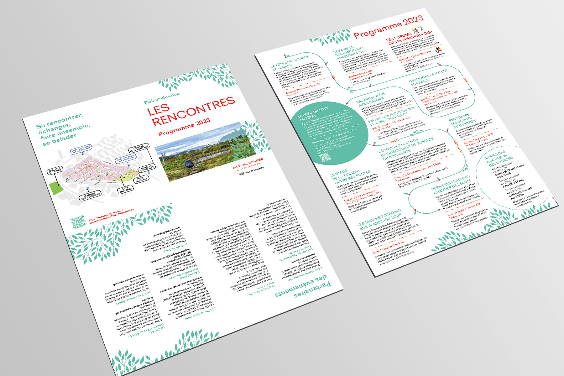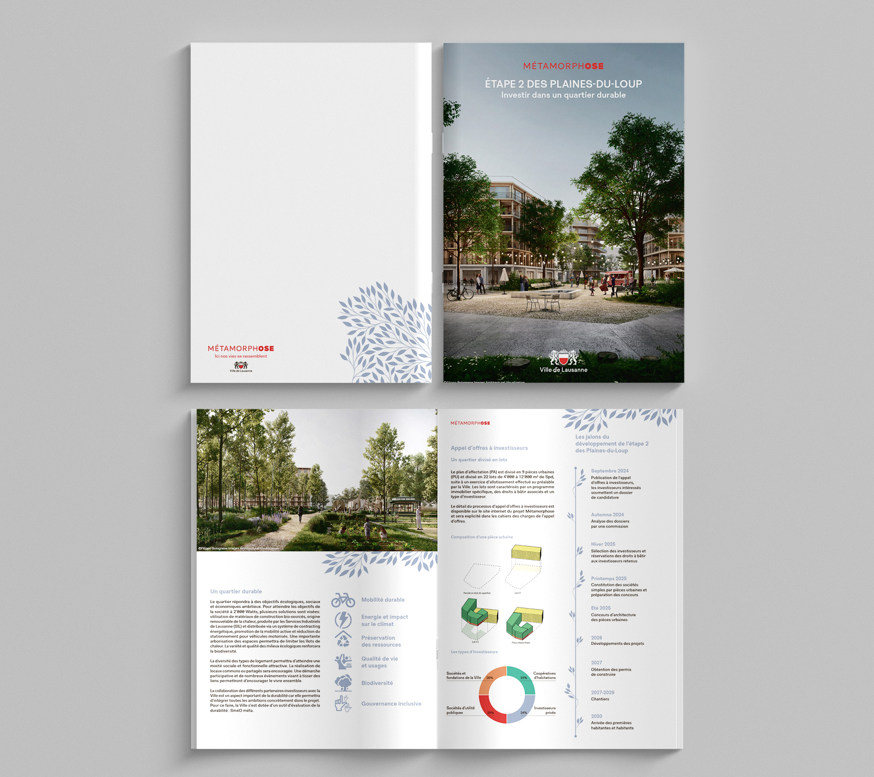 Enfin, la durabilité des nouveaux quartiers: on retrouve cette valeur dans les petites feuilles foisonnantes qui illustrent l’univers graphique de Métamorphose.