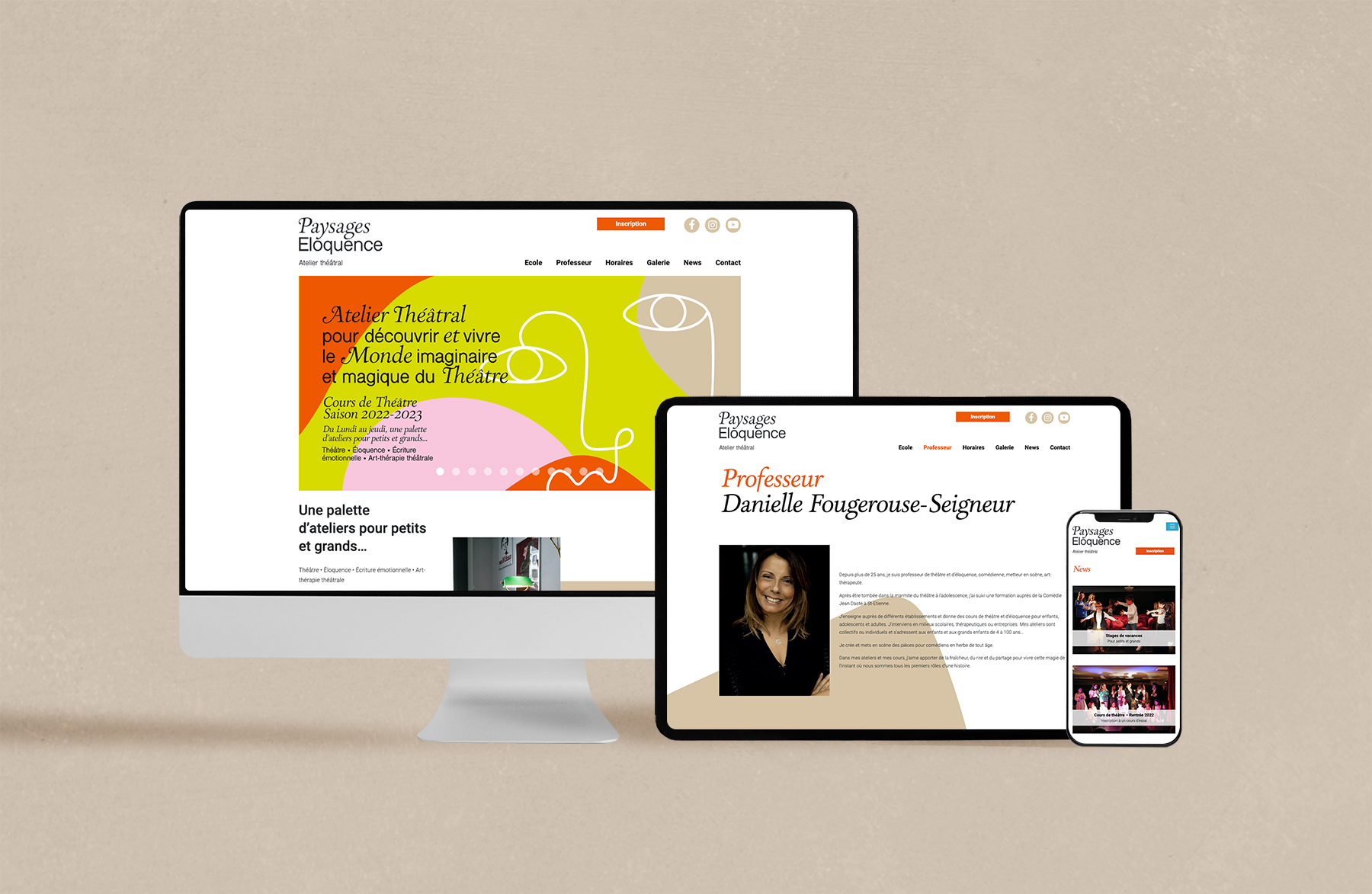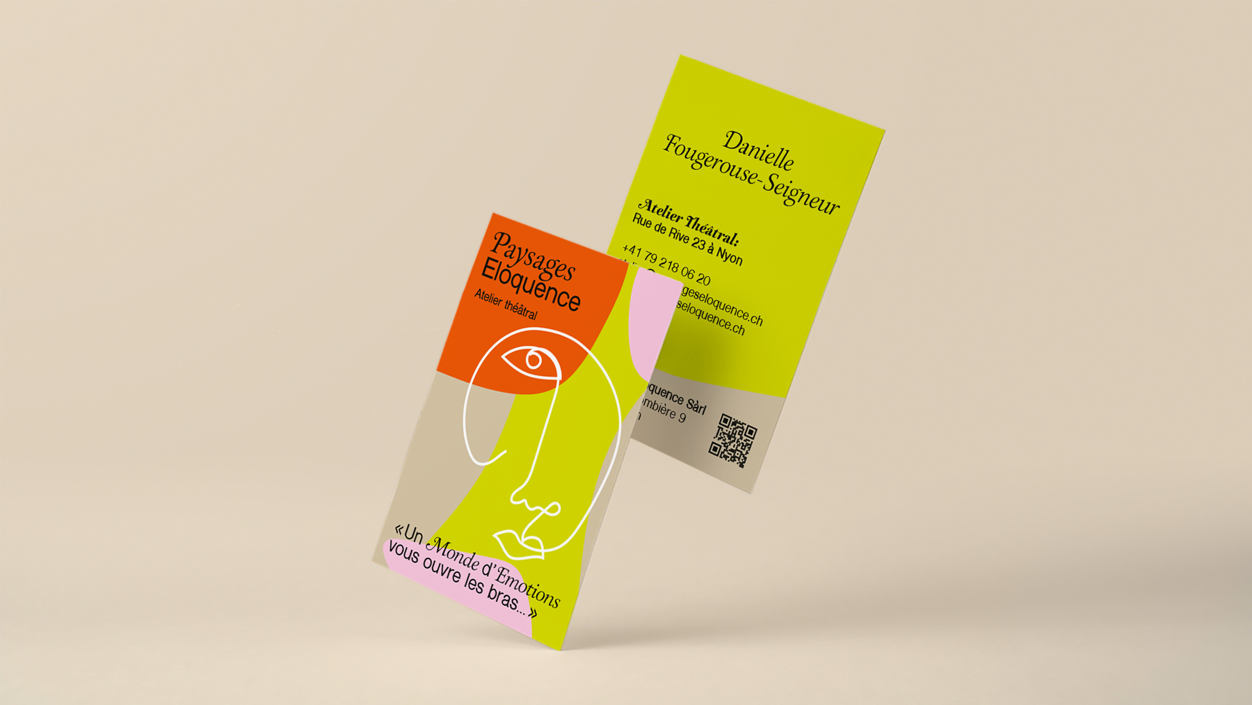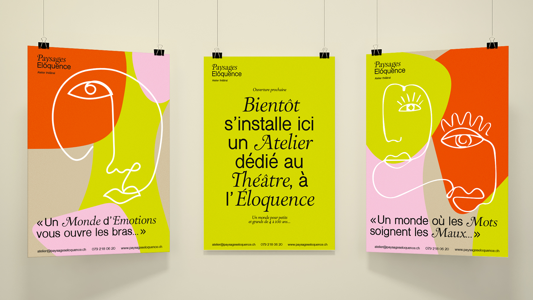 Vert, rose, orange pétillants nous conduisent à travers cet univers où deux typographies s’unissent pour créer le logo: l’une classique pour «Paysages», qui évoque les origines du théâtre; l’autre moderne et linéaire pour «Eloquence», qui symbolise la structure, la rigueur d’un art qui assure.